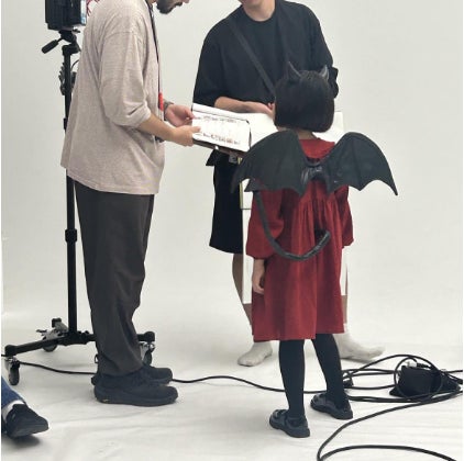 子あくま衣装に着替えると、とってもキュートな“子あくま柚乃”さんに変身。7種の動画を撮りきる長丁場の撮影になりましたが、長いセリフや難しい言い回しは何度も台本を読み込み、分からない言葉はひとつひとつ監督に確認して自分の言葉に落とし込むなど、大人顔負けのプロ意識の高さを発揮していました。