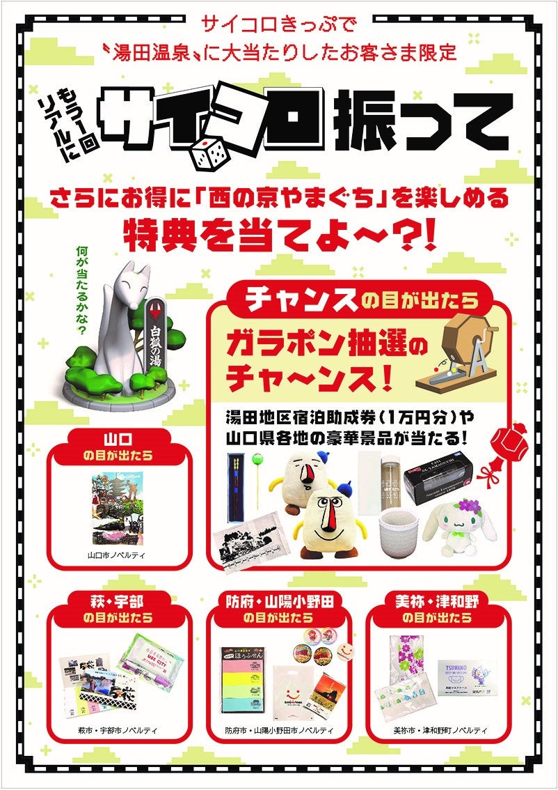 大きなサイコロを振って出た目に合わせて山口県央連携都市圏域(山口市近隣の7市町)の特産品やノベルティをプレゼント。さらにチャンスの目が出たら当日から使える湯田地区宿泊助成券(1万円)やレア景品が当たるガラポン抽選会に参加いただけます!