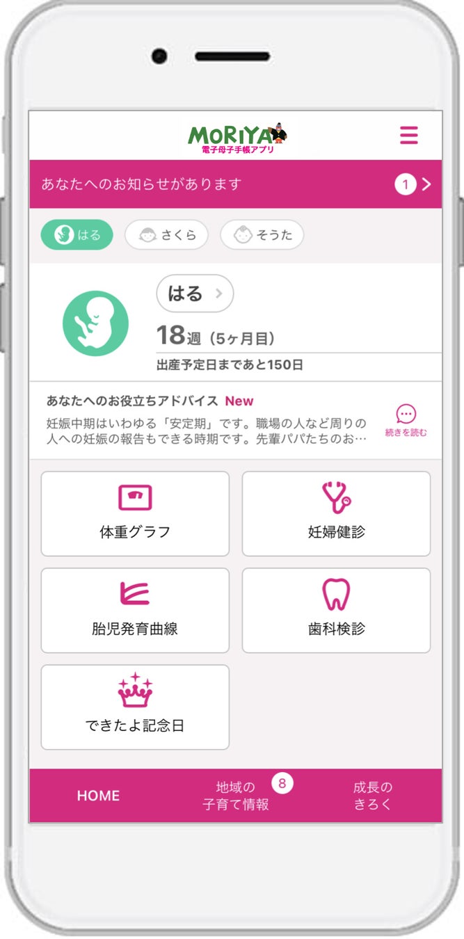 このたび、「MORIYA 電子母子手帳アプリ」の提供を開始する運びとなり、お手持ちのスマートフォンから子育てに関する情報の取得、妊娠届のWEB申請・面談予約などが可能となりました。このアプリを通して、情報や必要な支援へアクセスしやすくなり、より安心して子育てをしてもらえるよう、心から願っています。ぜひご活用ください。
