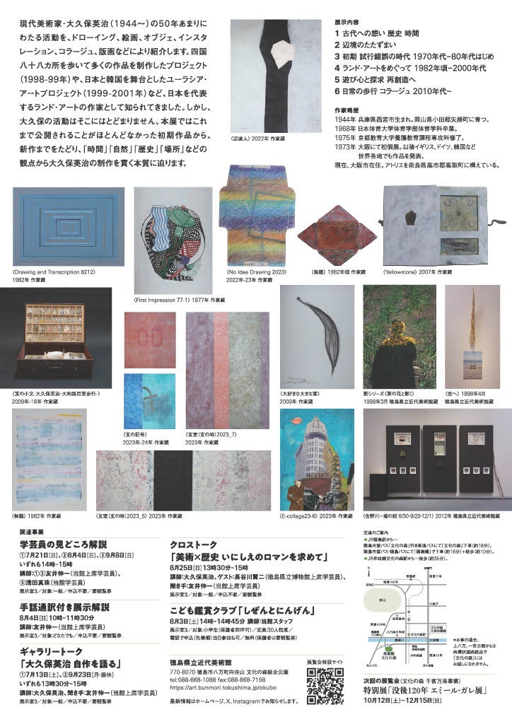 現代美術家・大久保英治(1944~)の50年あまりにわたる活動を、ドローイング、絵画、オブジェ、インスタレーション、コラージュ、版画などにより紹介します。四国八十八カ所を歩いて多くの作品を制作したプロジェクト(1998-99年)や、日本と韓国を舞台としたユーラシア・アートプロジェクト(1999-2001年)など、日本を代表するランド・アートの作家として知られてきました。しかし、大久保の活動はそこにはとどまりません。本展ではこれまで公開されることがほとんどなかった初期作品から、新作までをたどり、「時間」「自然」「歴史」「場所」などの観点から大久保英治の制作を貫く本質に迫ります。