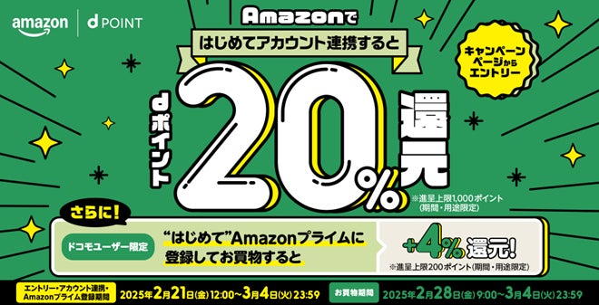 株式会社NTTドコモ(以下、ドコモ)は、アマゾンジャパン合同会社が運営する総合オンラインストアの「Amazon.co.jp」で「dアカウント®」と「Amazonアカウント」をはじめて連携してお買物すると、もれなくdポイント(期間・用途限定)を20%還元する「Amazon 新生活のお買物でdポイント20%還元キャンペーン」(以下、本キャンペーン)を、2025 年 2 月28日(金)から2025年3月4日(火)までの期間で開催いたします。