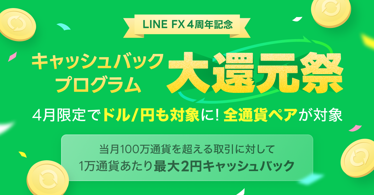 このたび、ユーザーへの日頃の感謝の気持ちを込めて、「キャッシュバックプログラム ~LINE FX 4周年記念 大還元祭~」を2024年4月1日(月)から4月30日(火)まで開催します。キャンペーン期間中は、これまで対象外だったドル/円を含む全通貨ペアが対象となり、新規取引1万通貨当たり最大2円のキャッシュバックを実施します。