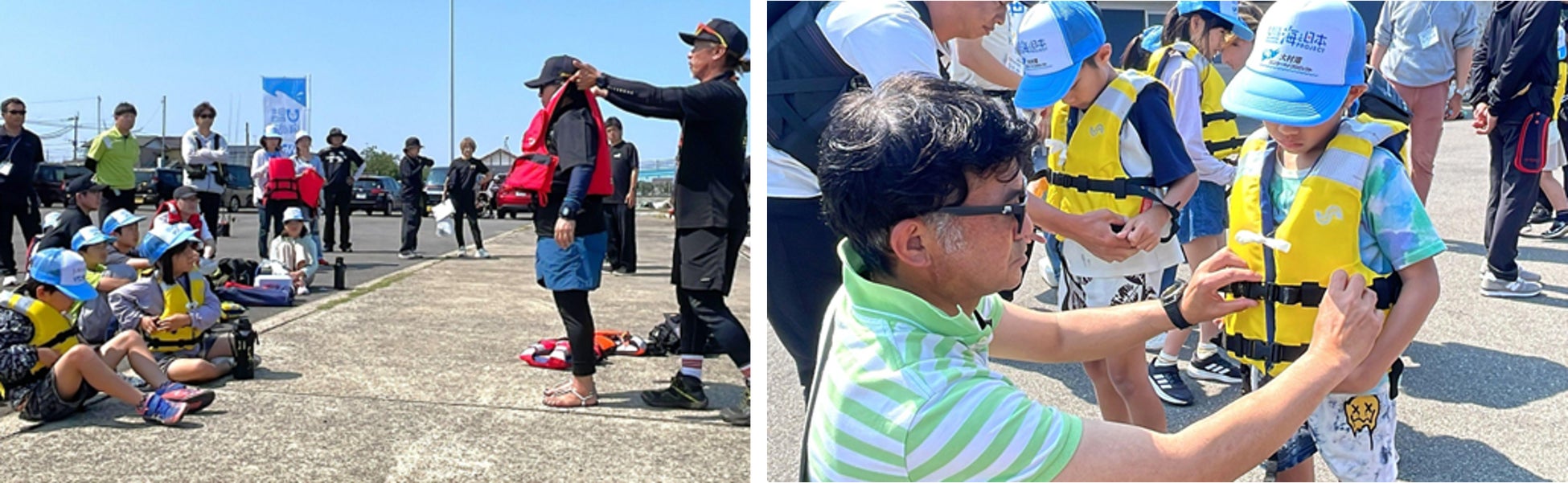 また、正しいライフジャケットの着用方法についても、ライフジャケットの違いを見せながら参加者にわかりやすく説明しました。「釣りは高い位置から海に落ちる可能性があり、正しくライフジャケットを着用しないと落ちた際にライフジャケットが抜けてしまう。必ずサイズに合ったものを着用し、股紐を通すようにしてください。また、膨張タイプのライフジャケットを着用するときは、浮力体がどのように膨らむのかを事前に確認しておくことが大切です」と説明しました。参加者はみんな真剣に話を聞いており、溺れを自分事と捉えてくれたようでした。