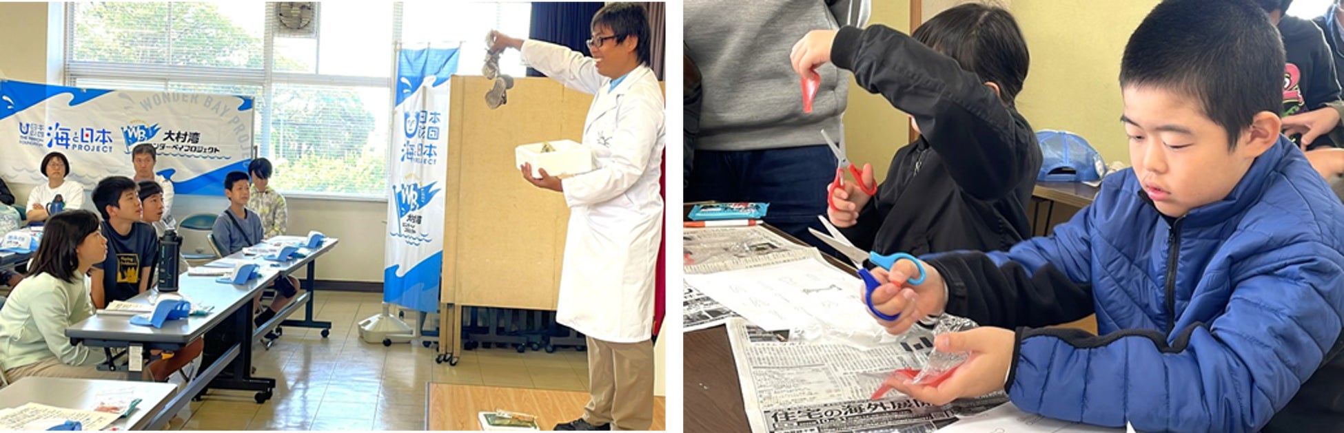 また、中村氏が実際に大村湾に潜って撮影した写真を見せながら、大村湾の海底や生き物の様子を説明すると、子ども達は興味深々に話しを聞いていました。また、「海藻がたくさん生えているね!でも今、この場所に海藻は1本も生えていません。このように海藻が減ってしまう現象を『磯焼け』と言います。海藻は生き物が卵を産み付けたり、生き物の住み家になります。海藻が減ると、海の生き物も減ってしまいます。磯焼けの原因は色々ありますが、人間の生活も影響しています」と中村氏が伝えると、子ども達は「ええー!」と声を上げて心配そうな様子でした。そして中村氏が「昨日大村湾の海底から獲ってきたごみです!」とたくさんの海洋ごみを子ども達に見せると、子どもたちは「こんなに海にごみがあるんだ」と真剣に見入っていました。中村氏が「大村湾は陸に囲まれているので、大村湾のごみはみんなが住んでいる街から出たごみがほとんどです。みんながごみをちゃんとごみ箱に捨てるだけでも、大村湾のごみは減らすことができます。みんなで一緒に大村湾をキレイにするために取り組みましょう!」と話しました。