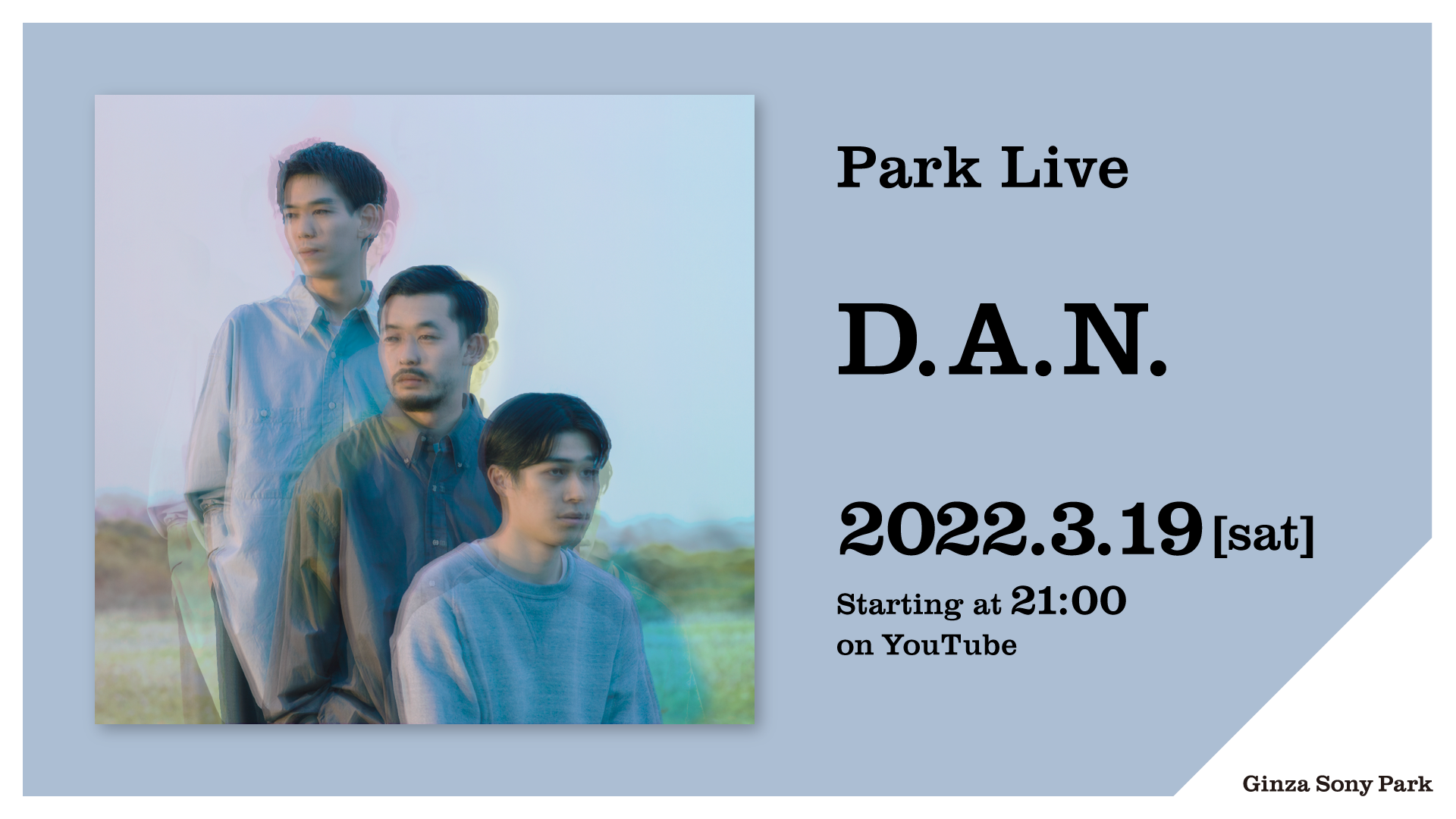 2022年3月19日(土) 21:00〜のPark Liveは、国内外で高い評価を獲得し続けるD.A.N.。ニューアルバム『NO MOON』を引っ提げ、配信では初となる3人編成での出演です。演出に「Anthem」のMVを手掛けた映像作家のRyuichi Onoを迎えたパフォーマンスで、建て替え工事中のGinza Sony Parkから、YouTubeのライブ配信でお届けします。