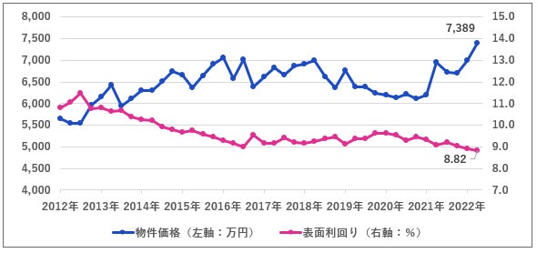 2022年4~6月期では全物件種別において平均利回りが低下し、平均価格が上昇した。一棟アパートは2012年の集計開始以来、過去最高額の7389万円を記録した。一棟マンションは前四半期からプラス1224万円だが、2021年10~12月期からの推移をみるとほぼ横ばいである。区分マンションは3四半期連続で価格が下落していたが、今四半期では価格が上昇し、利回りも低下している。1700万円台を記録したのは2021年4~6月期ぶり。全物件種別で価格が上昇したのは2021年4~6月期と1年ぶりであり、ここから不動産価格が引き続き上昇していくかは注目していきたい。
