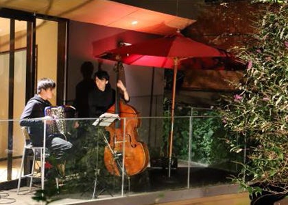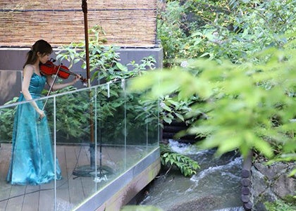 渓谷庭園を流れる川から響く水の音や虫の声と、豊かな演奏がともに重なる、天悠ならではの夏の調べを感じながら、優雅なひとときをお過ごしください。