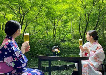 自然に囲まれた天悠の渓谷庭園でビアガーデンを開催。生ビールのほか、10種類の ビアカクテルや7種類のモヒート、クリームソーダなど涼やかなドリンクに、お酒に合うおつ まみ各種をご用意。