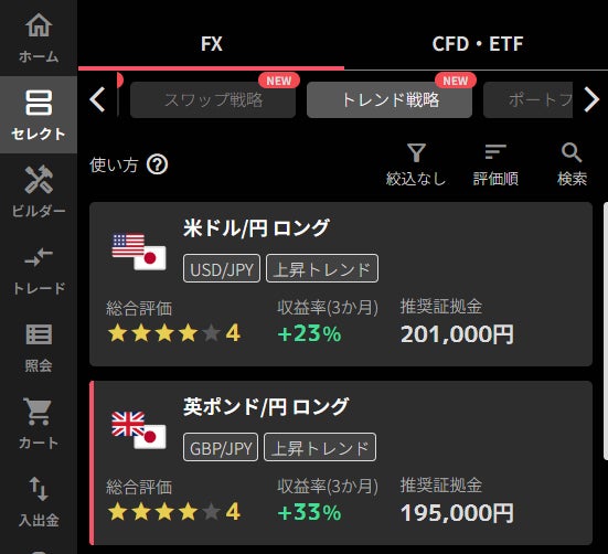 新しくカテゴリーに追加された「トレンド戦略」では、5つの対円通貨ペアの買戦略・売戦略に特化した自動売買が用意されており、収益獲得をサポートします。