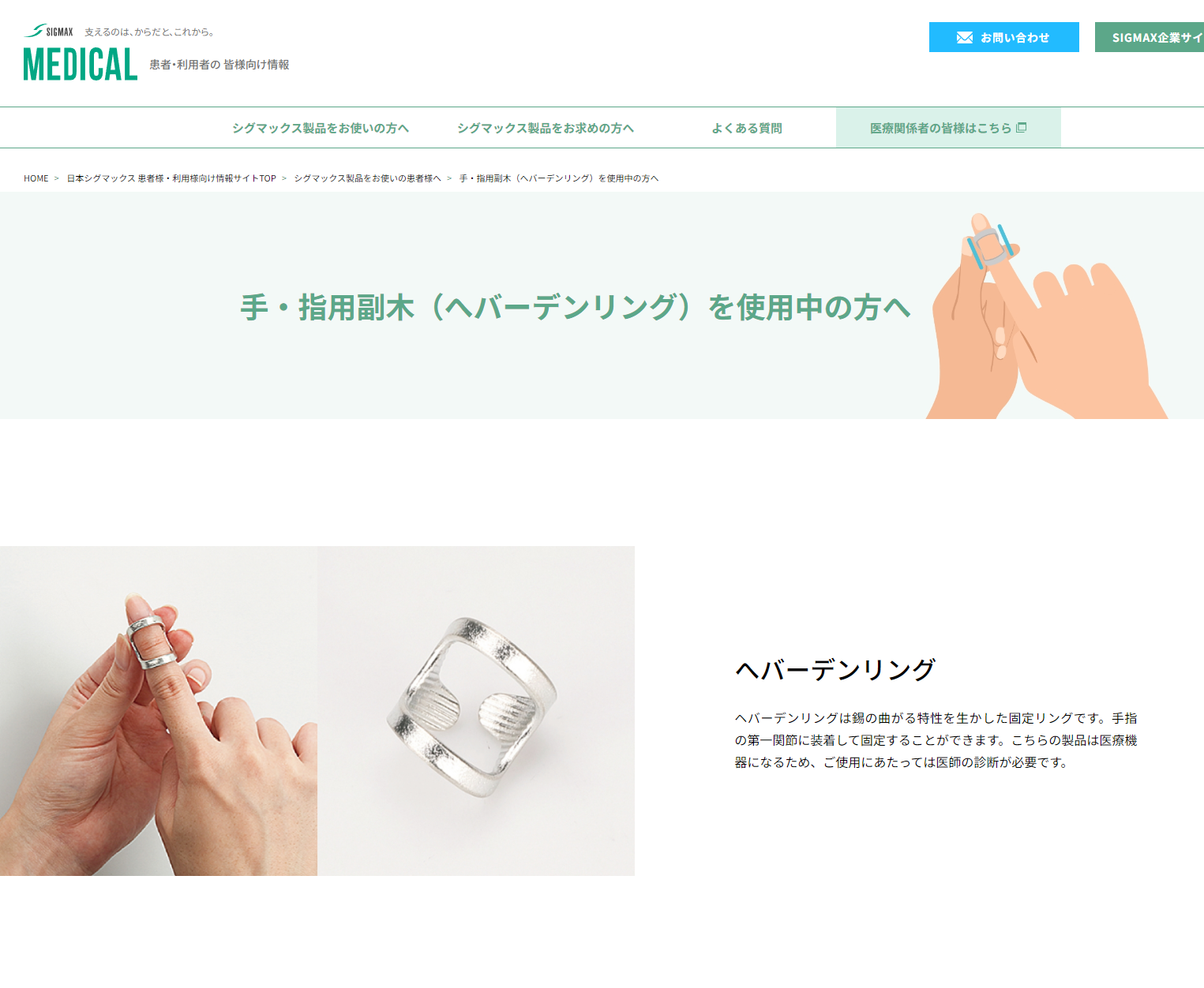 今回の発売開始に合わせて、ヘバーデンリングを使用中の方へ向けた情報を、日本シグマックス メディカルサイト内で提供しております。以下のアドレスからご覧ください。