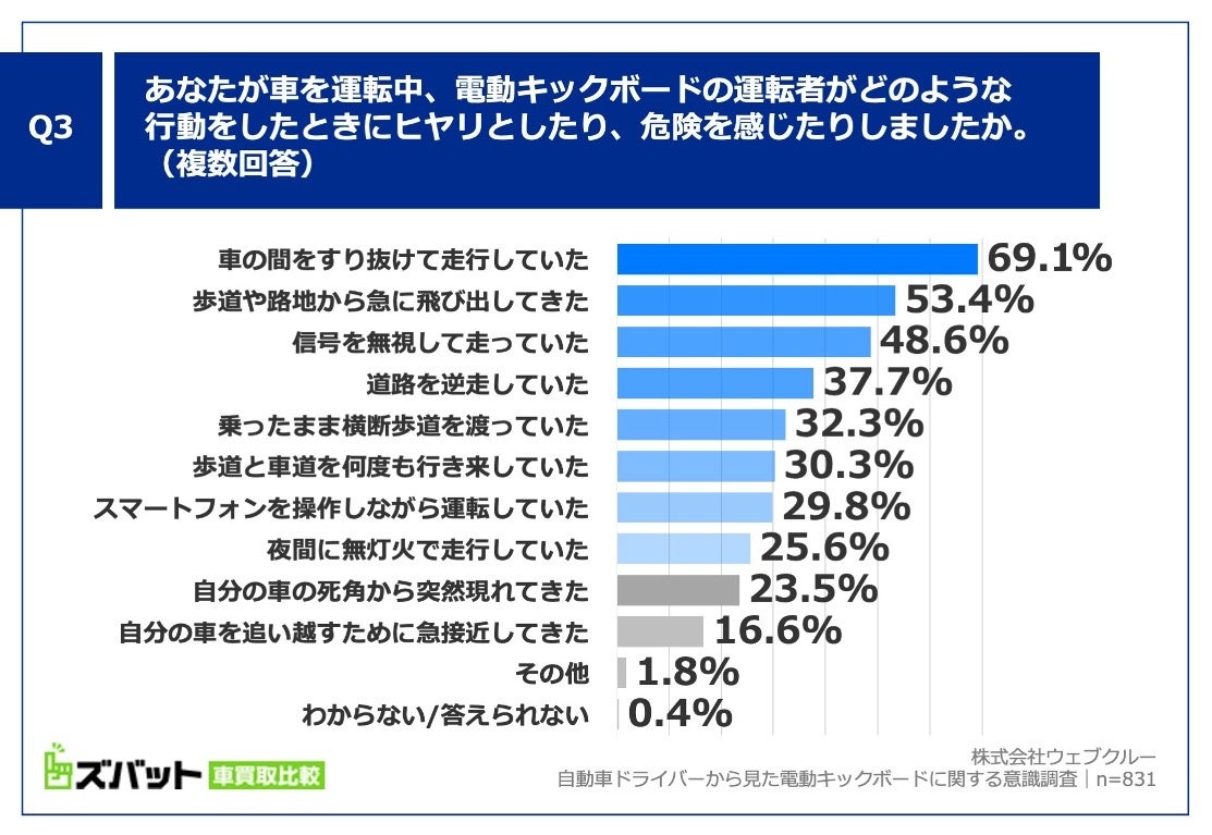 Q2で、車を運転中に電動キックボードの走行を見てヒヤリとしたり、危険を感じたりした経験が「何度もある」「一度だけある」と回答した方に、「Q3. あなたが車を運転中、電動キックボードの運転者がどのような行動をしたときにヒヤリとしたり、危険を感じたりしましたか。(複数回答)」(n=831)と質問したところ、「車の間をすり抜けて走行していた」が69.1%、「歩道や路地から急に飛び出してきた」が53.4%、「信号を無視して走っていた」が48.6%と上位を占めました。