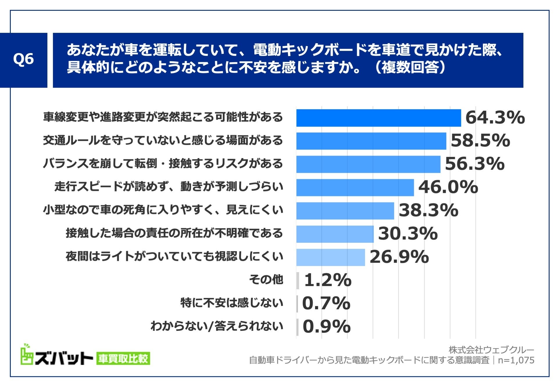 Q1で、車を運転しているときに車道を走行する電動キックボードについて「まったく見かけたことがない」「わからない/答えられない」以外の回答を選択した方に、「Q6. あなたが車を運転していて、電動キックボードを車道で見かけた際、具体的にどのようなことに不安を感じますか。(複数回答)」(n=1,075)と質問したところ、「車線変更や進路変更が突然起こる可能性がある」が64.3%、「交通ルールを守っていないと感じる場面がある」が58.5%、「バランスを崩して転倒・接触するリスクがある」が56.3%で上位を占めました。