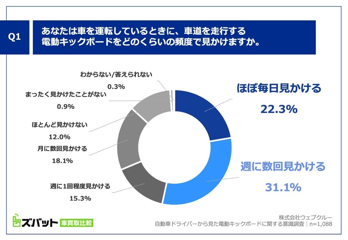 はじめに、今回のアンケート対象者である「週に3日以上車を利用しており、運転中に電動キックボードを見かけた経験のある5大都市(札幌市内・東京23区内・名古屋市内・大阪市内・福岡市内)在住の男女」1,088名に、「Q1. あなたは車を運転しているときに、車道を走行する電動キックボードをどのくらいの頻度で見かけますか。」(n=1,088)と質問したところ、「ほぼ毎日見かける」が22.3%、「週に数回見かける」が31.1%となり、合わせて53.4%が週に複数回、電動キックボードの車道走行を目にしていると回答しました。