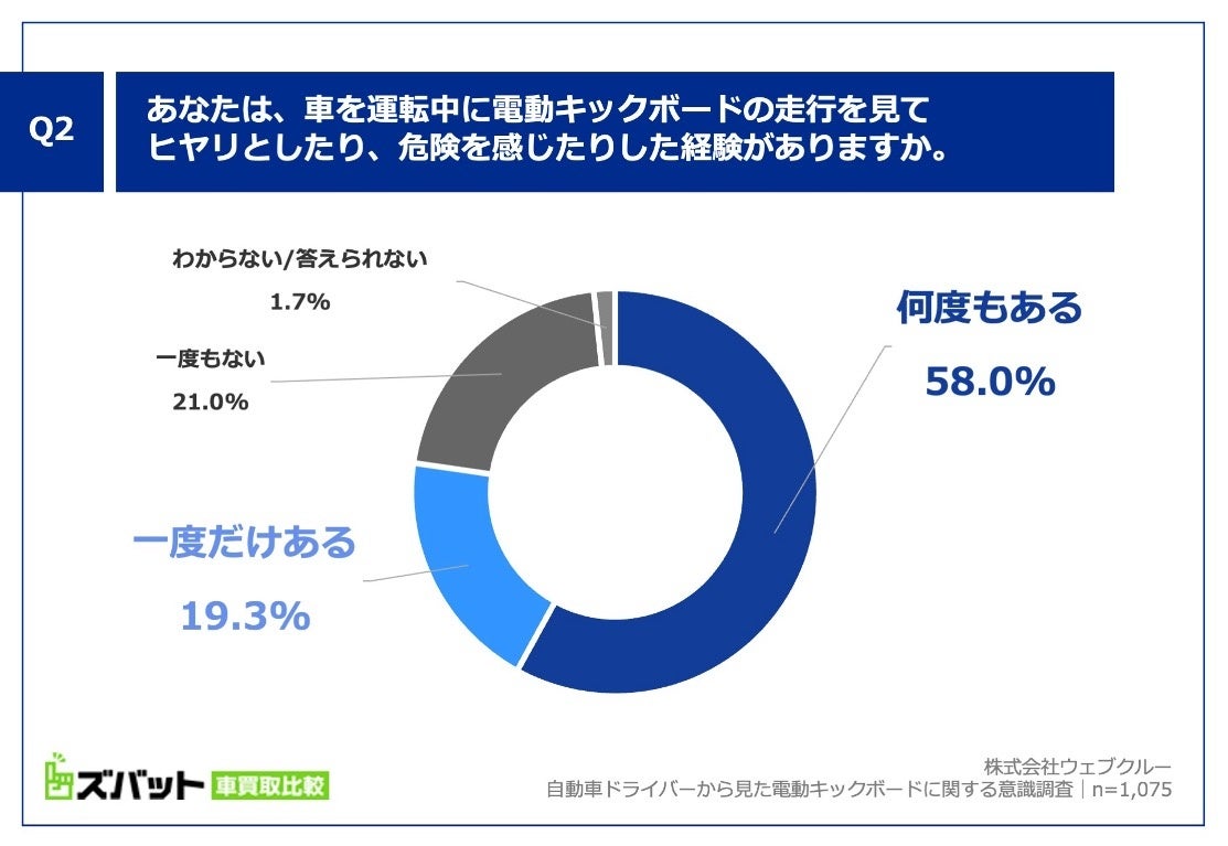 また、Q1で「まったく見かけたことがない」「わからない/答えられない」以外を回答した方に、「Q2. あなたは、車を運転中に電動キックボードの走行を見てヒヤリとしたり、危険を感じたりした経験がありますか。」(n=1,075)と質問したところ、「何度もある」が58.0%、「一度だけある」が19.3%という回答となり、合わせて77.3%の人が「ヒヤリとしたり、危険を感じたりした経験がある」ことがわかりました。
