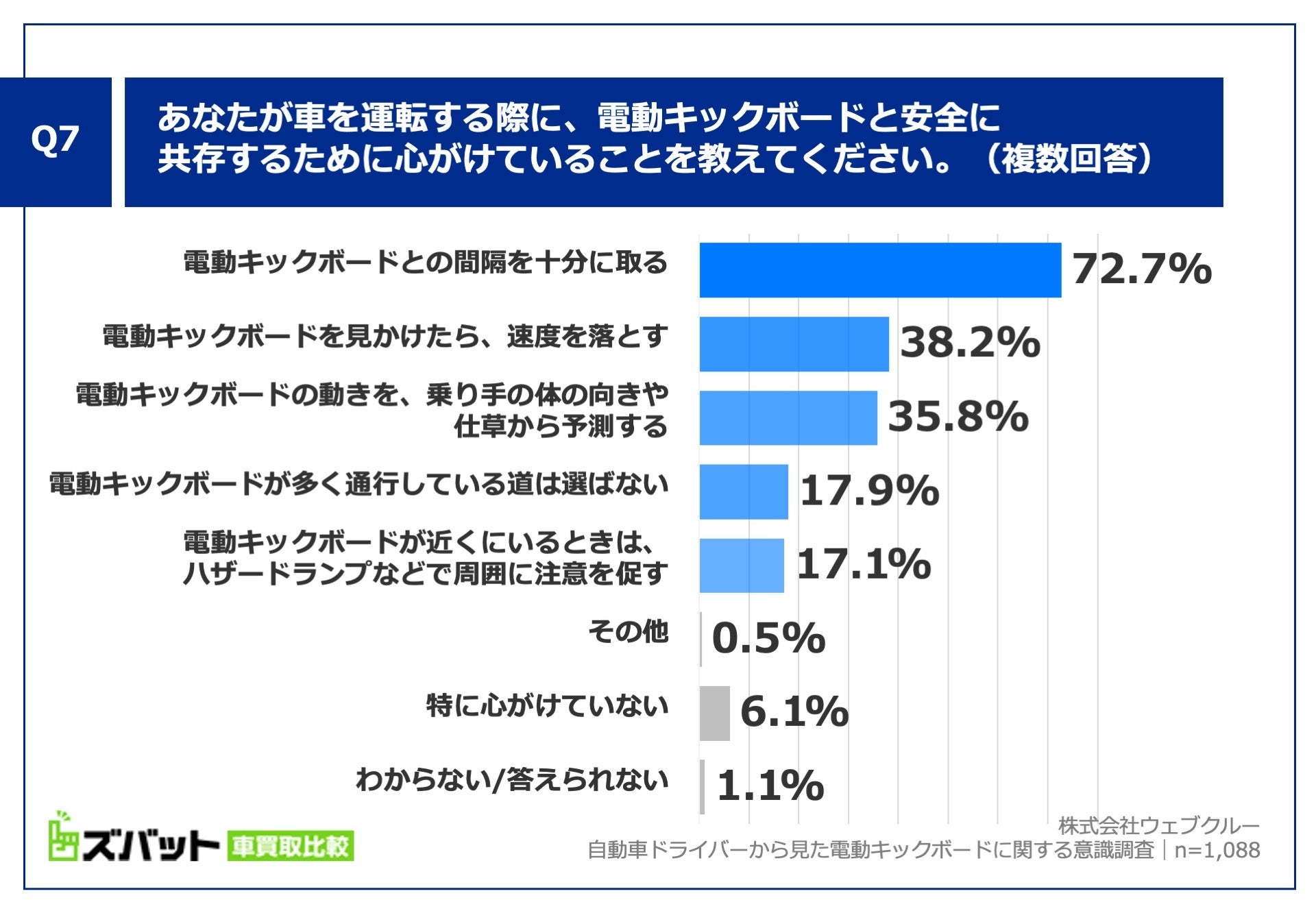 「Q7. あなたが車を運転する際に、電動キックボードと安全に共存するために心がけていることを教えてください。(複数回答)」(n=1,088)と質問したところ、「電動キックボードとの間隔を十分に取る」が72.7%、「電動キックボードを見かけたら、速度を落とす」が38.2%、「電動キックボードの動きを、乗り手の体の向きや仕草から予測する」が35.8%という結果になりました。