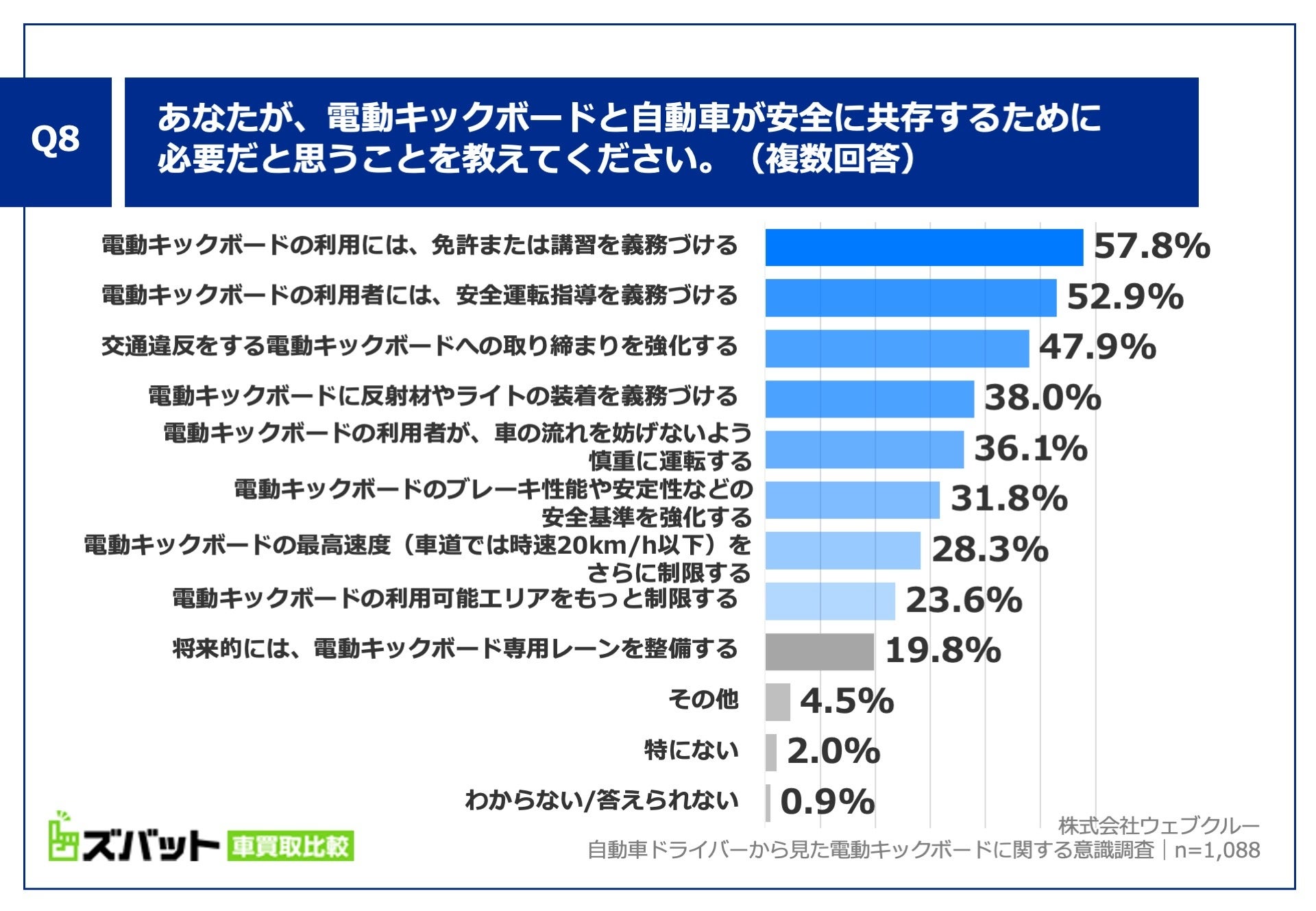 最後に「Q8. あなたが、電動キックボードと自動車が安全に共存するために必要だと思うことを教えてください。(複数回答)」(n=1,088)と質問したところ、「電動キックボードの利用には、免許または講習を義務づける」が57.8%、「電動キックボードの利用者には、安全運転指導を義務づける」が52.9%、「交通違反をする電動キックボードへの取り締まりを強化する」が47.9%という回答となりました。(※3)