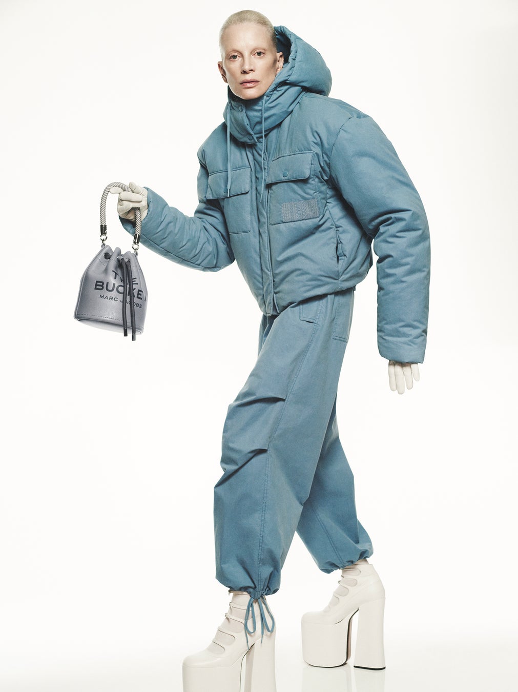 鮮やかなブルーが目を引くショート丈カーゴジャケットは、高めのネックラインがランウェイのシルエットを彷彿させ、フロントポケットにはバーコードモノグラムのロゴが刺繍で施されています。コットンナイロンを使用したパラシュートパンツは、同じくランウエイからインスパイアされたバギーなシルエットが印象的です。