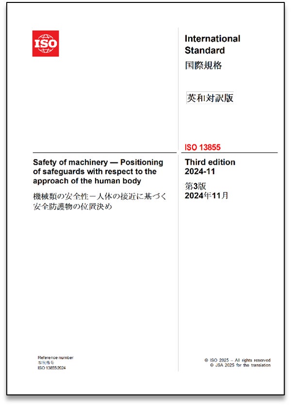 一般財団法人日本規格協会(本部:東京都港区、理事長:朝日弘)は、2025年6月2日(月)に「ISO 13855:2024機械類の安全性 - 人体の接近に基づく安全防護物の位置決め」の邦訳(英・日対訳版)を発行いたしました。