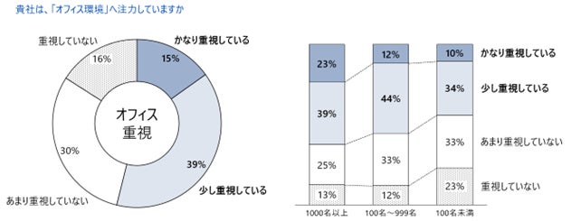 また、オフィス環境への注力度合いは会社規模と相関しており、従業員規模1,000名以上のエンタープライズ企業においては62%が重視していると回答している一方で、100名未満は44%が重視と18%の乖離がありました。
