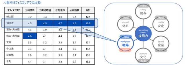 大阪府のオフィスエリア分類を採用額観点で評価した結果、「利便性」以外の「周辺環境」「先進性」「創造性」においてうめきたエリアの数値が最も高く、合計で18.9ptという結果でした。