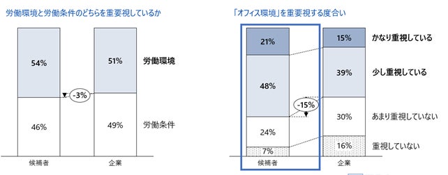 2. オフィス環境を重視している企業が54%に対し、求職者の重視度は69%、15%の乖離