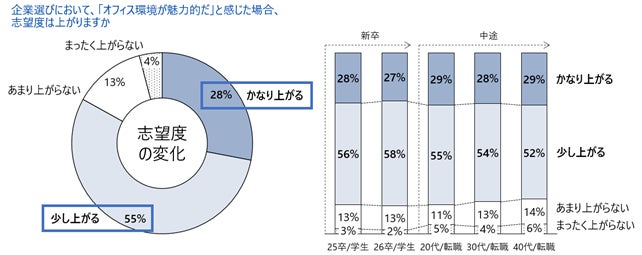 その結果、企業選びでオフィス環境を重視すると答えた求職者は「69%」、オフィス環境が魅力的だと感じた場合、志望度がかなり上がると答えた人は「28%」、少し上がると答えた人は「55%」で8割を超えています。