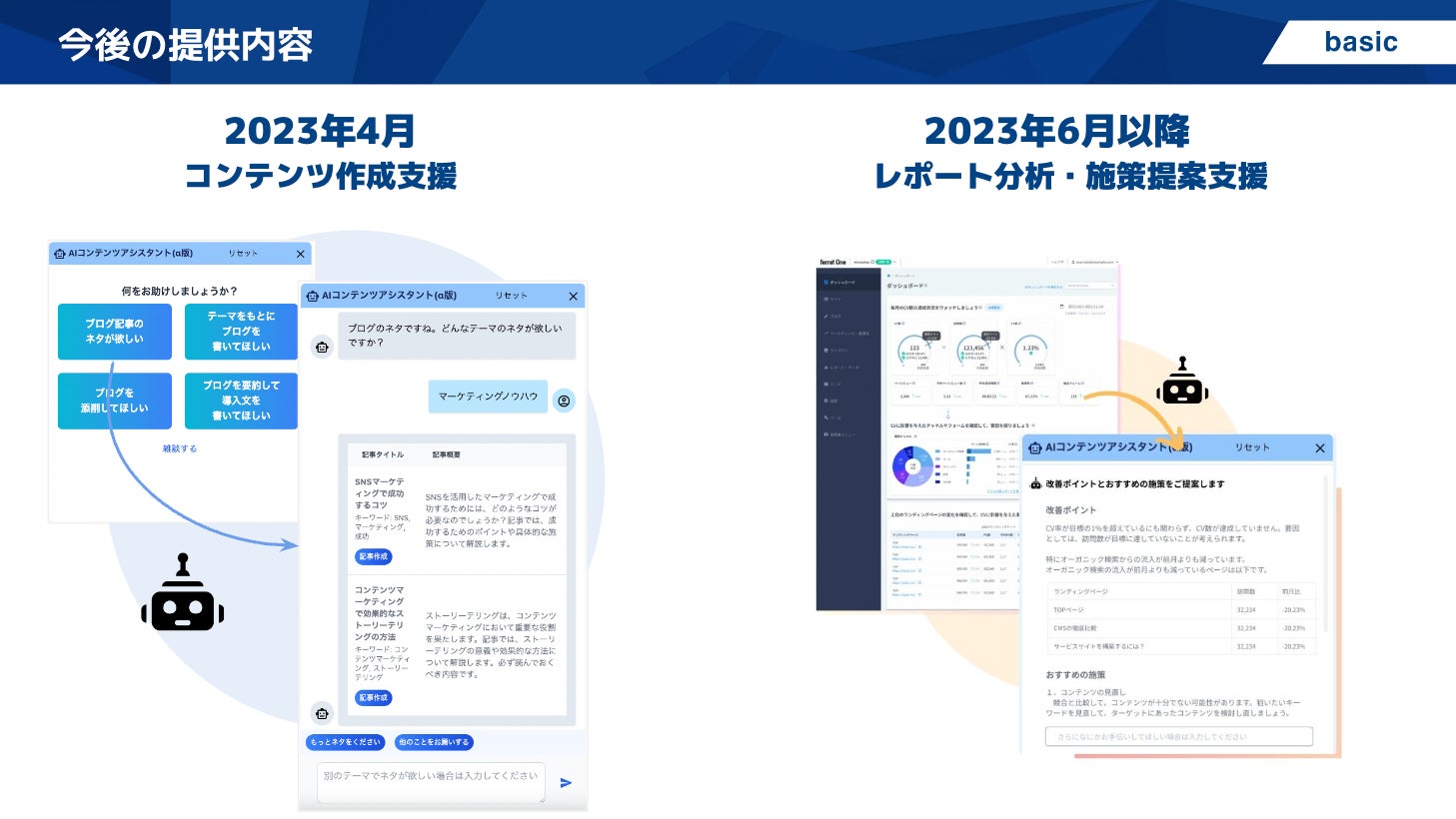 BtoBにおいては、50%超の買い手が営業パーソンとの接触前に意思決定を行っていると言われており、営業パーソンの代替機能を果たすようなコンテンツをWebサイトに掲載することが必須となっています。そこで、2023年4月には、成果の出るコンテンツ作成のコツを『ChatGPT』に相談できる機能を30社限定で提供いたします。
