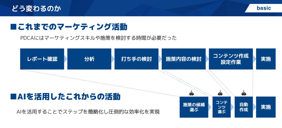 Webマーケティングでは、施策実施時にツールの機能設定で多くの時間が消費されていました。『ferret One』では、AIを活用し、その指示内容を各機能に自動で設定することで、ツールの学習コストをほぼゼロに近づけてまいります。