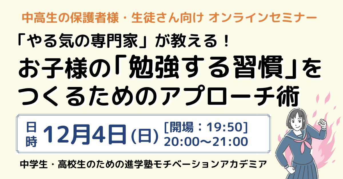 ~中学生・高校生の保護者様向けオンラインセミナー『「やる気の専門家」が教える!お子様の「勉強する習慣」をつくるためのアプローチ術』~