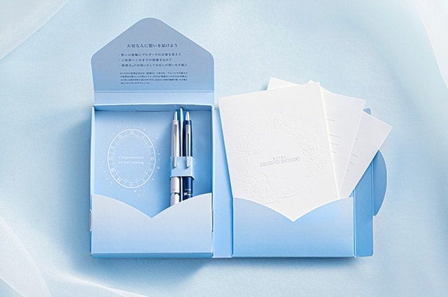 婚姻届や何か大切なものを書く時に使用するペンと、想いを繋ぎ絆を深める手紙がセットになったアイテムです。日本には、結婚25周年には「銀婚式」、30周年には「金婚式」と節目を祝う文化があります。結婚1年目には「紙婚式」というものがあり、アルバムや手帳などの紙製品を贈ることが習わしです。想いをかたちにするブランドだからこそこちらの特典をご用意いたしました。