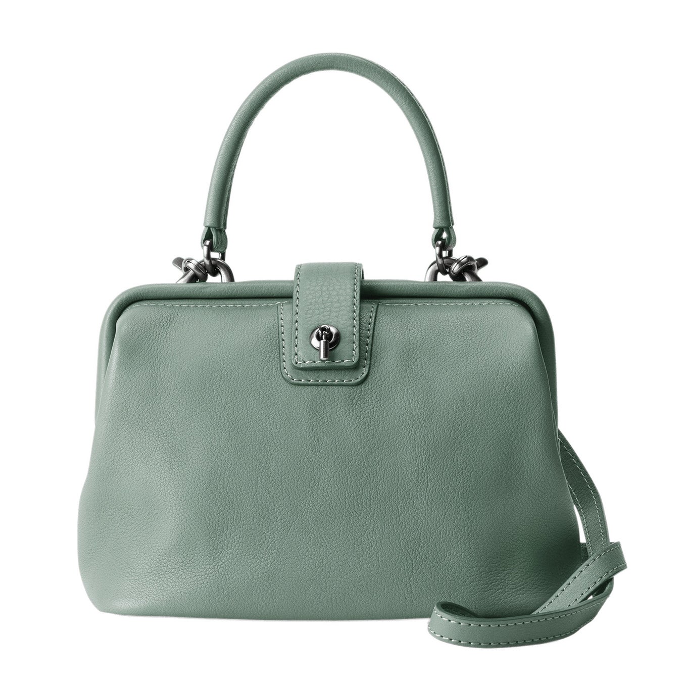 持ち物が快適に収まる箱型設計の本作は、外出に必要な最小限の小物が効率良く収まります。 トップの口金は大きく開いたまま留められるので、中が見やすくなっている点もポイント背面には、頻繁に出し入れするキーケースなどを収納可能なファスナーポケットを設けるなど、実用性もしっかり意識したショルダーです。