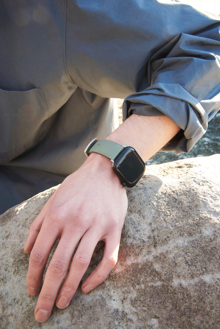 「トーンオイルヌメ」と同じ定番素材「オイルヌメ革」で仕立てた、アップルウォッチバンドです。Apple Watchの仕様に合わせて、簡単に着脱可能。直接腕に触れる部分には肌触りの良い牛革を使用し、手首に優しくフィットします。Apple WatchのサイズによってセレクトできるSとLの2サイズを展開。