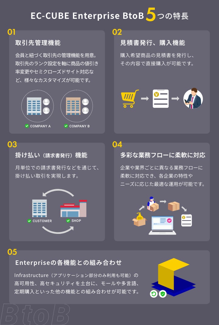 このような背景から、EC-CUBEの良さはそのままに、BtoB ECに最適化された機能と安全性の高いインフラ環境および、企業のDX推進や様々な企業・業種のBtoB ECに柔軟に対応できるサービスとして「EC-CUBE Enterprise BtoB」を開発いたしました。