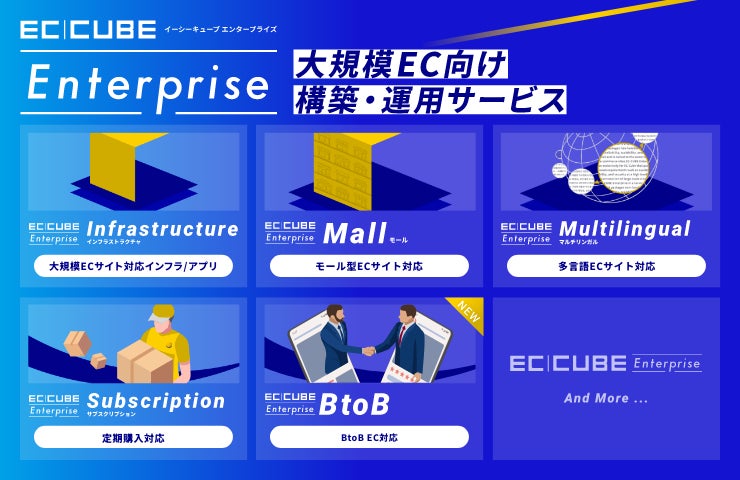 また、先にリリースされた「EC-CUBE Enterprise」のサービス「Infrastructure(大規模EC基盤)」「Mall(モール型EC)」「Multilingual(多言語対応EC)」「Subscription(定期購入EC)」と自由に組み合わせが可能で、大規模なBtoB ECを構築・運用するための最適なサービスです。