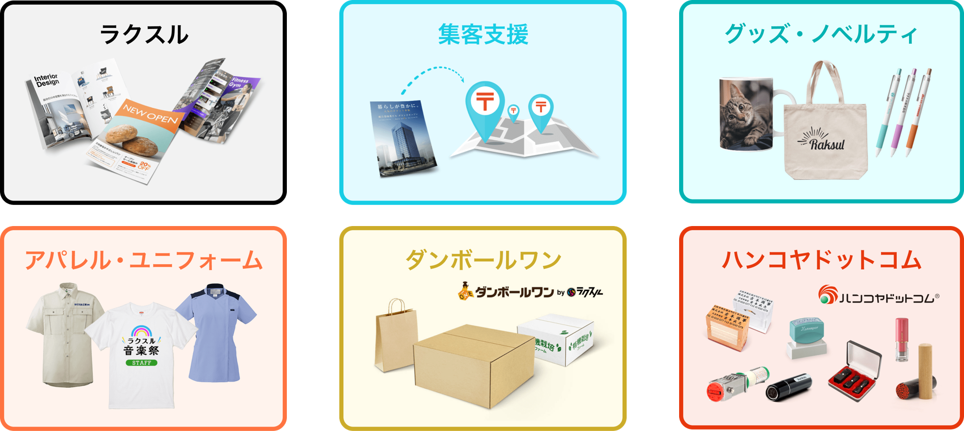 ラクスルは「はたらく人をラクにするカスタマイズECプラットフォームをつくる」を事業ミッションに掲げ、これまで様々な企業の事務印刷や販促・宣伝活動において必要な印刷物・グッズ類を提供してまいりました。ラクスルのサービス特徴である「24時間ご注文や入稿を受付けていること」、「低価格」、「小ロット納品」に対応していることは小規模企業者の方から特にご好評をいただいております。