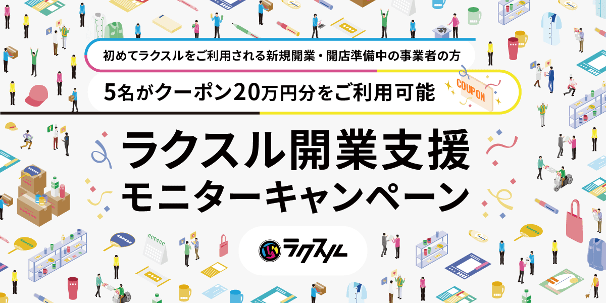 開業・開店準備を機に初めてラクスルをご利用される方5名が20万円分のモニタークーポンをご利用いただける「ラクスル開業支援モニターキャンペーン」を実施。
