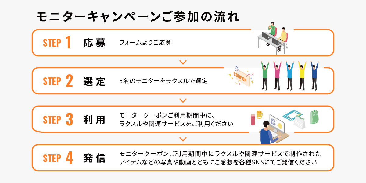 モニターに選定された方には、ラクスルの各種サービスをご利用いただき、ご活用内容をSNS等でご紹介いただくことにより、多くの方が新たな事務印刷や販促活動の手法を知るきっかけになることを期待しています。