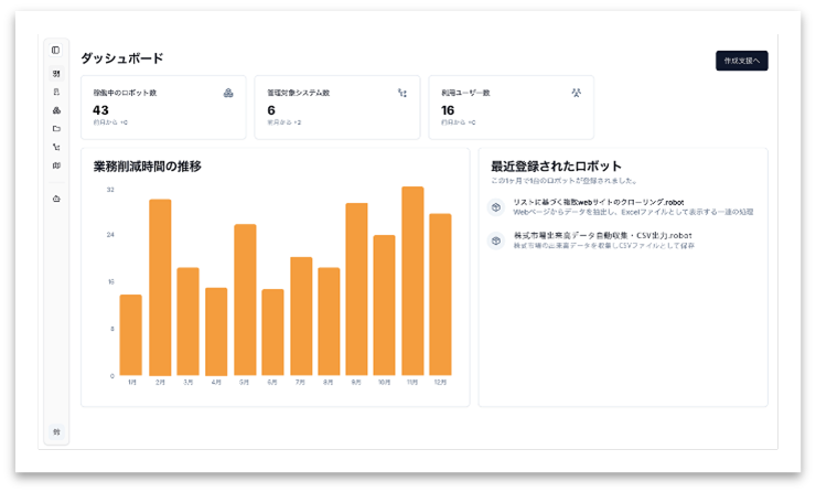 BizRobo! AI Appsは、AIを活用してRPAの運用・管理を支援するサービスです。AIがRPAの運用負荷を軽減し、導入効果の最大化を目指します。