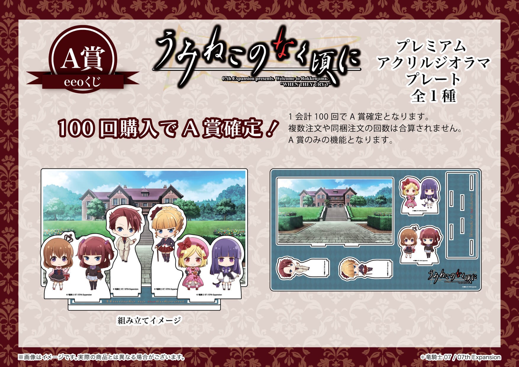 A賞は、『うみねこのなく頃に』の「eeoくじ」を1会計で100回ご購入いただくと確実に入手できます。詳細は画像をチェック!