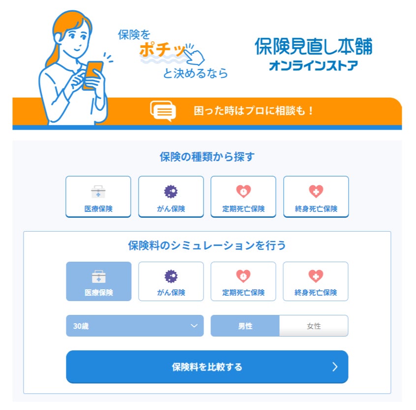 性別や年齢を入力するだけで、保険見直し本舗がおすすめする保険や保険ランキングが表示され、最適な保険商品を比較・検討可能。