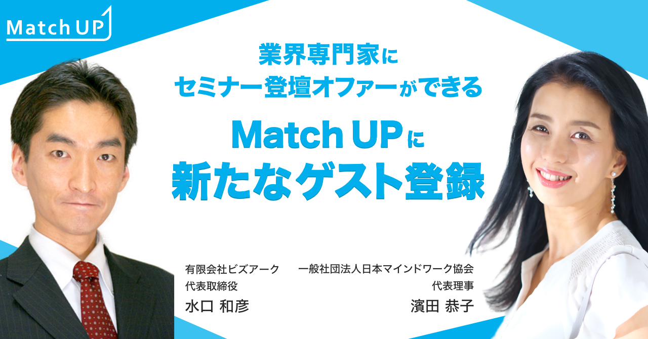 業界専門家にセミナー/イベント登壇のオファーができる「Match UP」、一般社団法人日本マインドワーク協会 濱田 恭子氏、有限会社ビズアーク 水口 和彦氏などが新たにゲスト登録!
