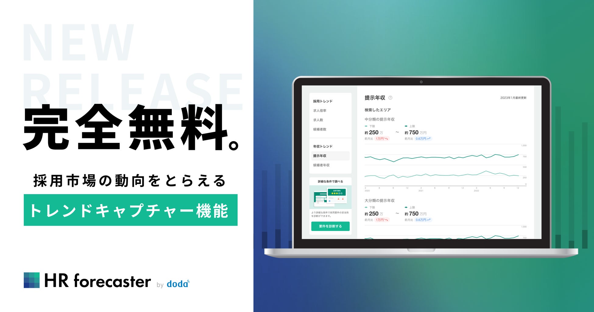 「トレンドキャプチャー※1」は、転職サービス「doda」が有する200万件以上におよぶデータ※2をもとに、採用トレンド(doda転職求人倍率、求人数、候補者数)と年収トレンド(提示年収、候補者年収)の2軸で、“過去”から“現在”にいたるまでの採用市場の動向を可視化する「HR forecaster」の新機能です。