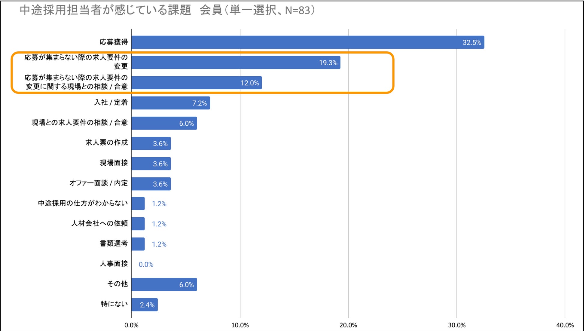 「HR forecaster」が、企業の採用担当者を対象に行った調査※3で課題感を尋ねたところ、19.3%が「応募が集まらない際の求人要件の変更」、12.0%が「応募が集まらない際の求人要件の変更に関する現場との相談/合意」(12.0%)と回答。最も多かった32.5%の「応募獲得」に続き、のべ31.3%の「求人要件の変更」が2番目に多い結果となりました。