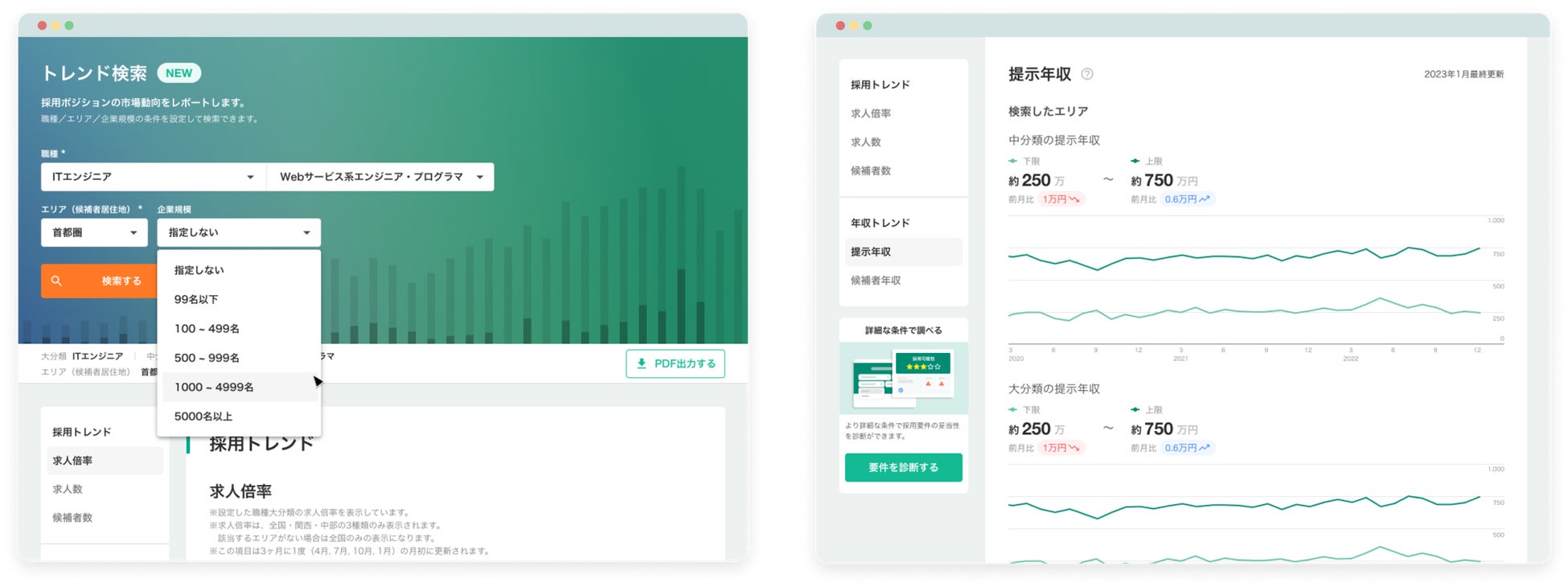 職種・エリア・企業規模を設定するだけで、過去から現在までの採用市場の動きを確認することが可能に
