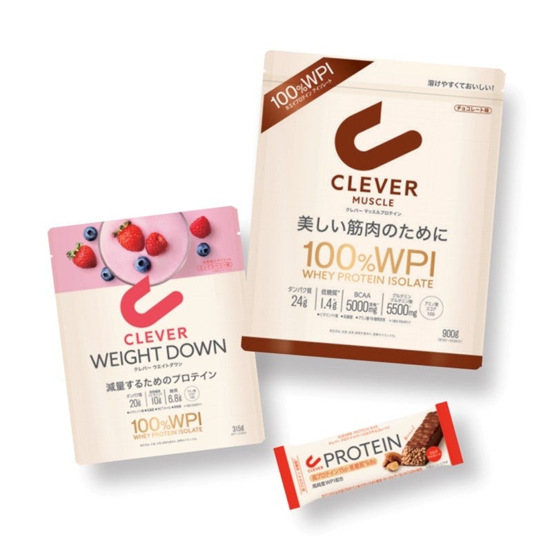 クレバーのプロテインシリーズは、最高品質のWPI(ホエイプロテインアイソレート)を100%配合し、賢く、効率よく、バランスのとれた理想的な体型を目指す方を応援するボディメイクシリーズです。