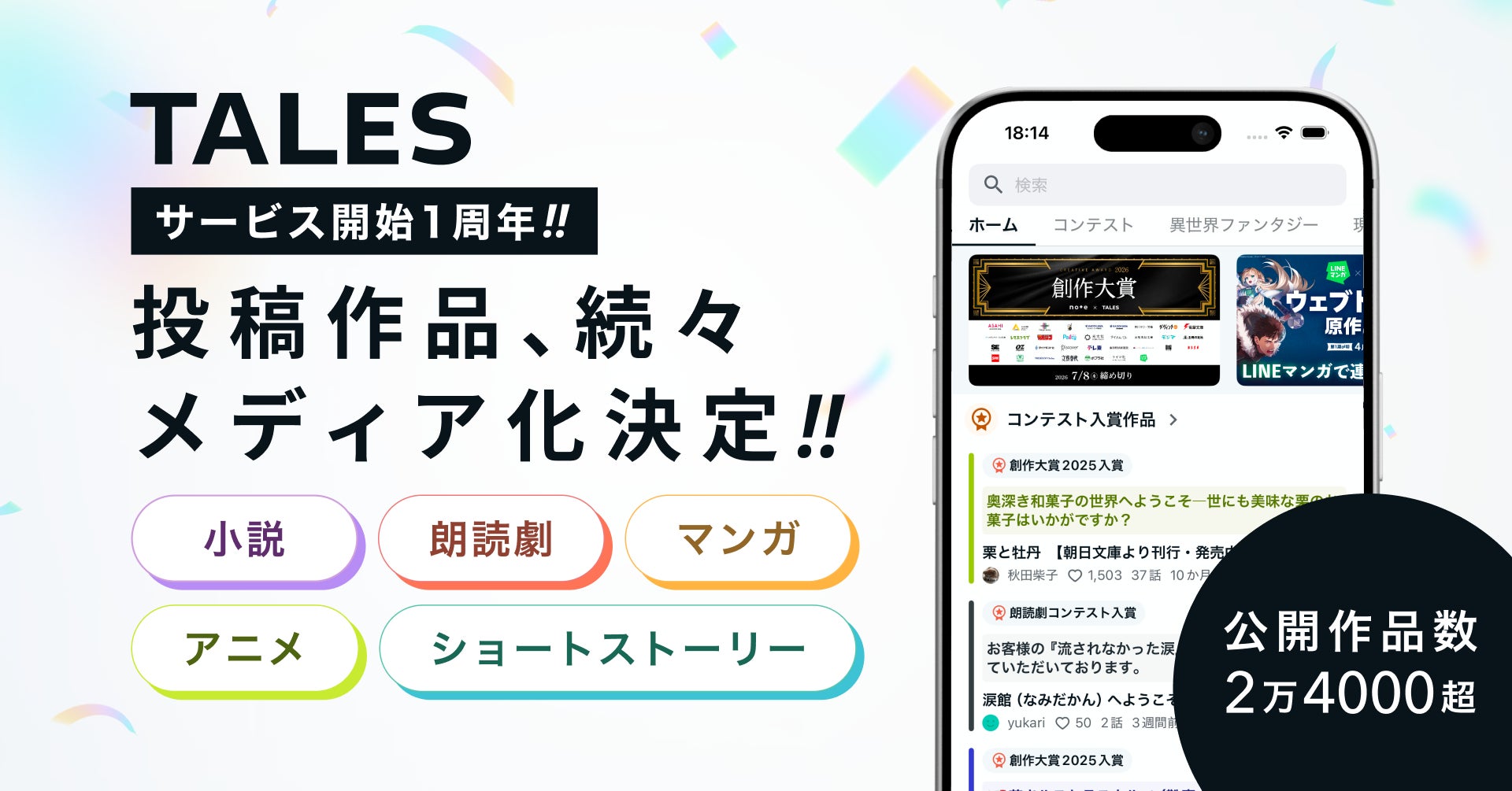 note株式会社とTales & Co.株式会社が共同運営する物語投稿サイト TALES(テイルズ)は、4月22日にサービス開始から1周年を迎えました。公開作品数は2万4000を超え、投稿作品の書籍化や朗読劇が実現するなど、物語が読者に届くかたちも広がっています。