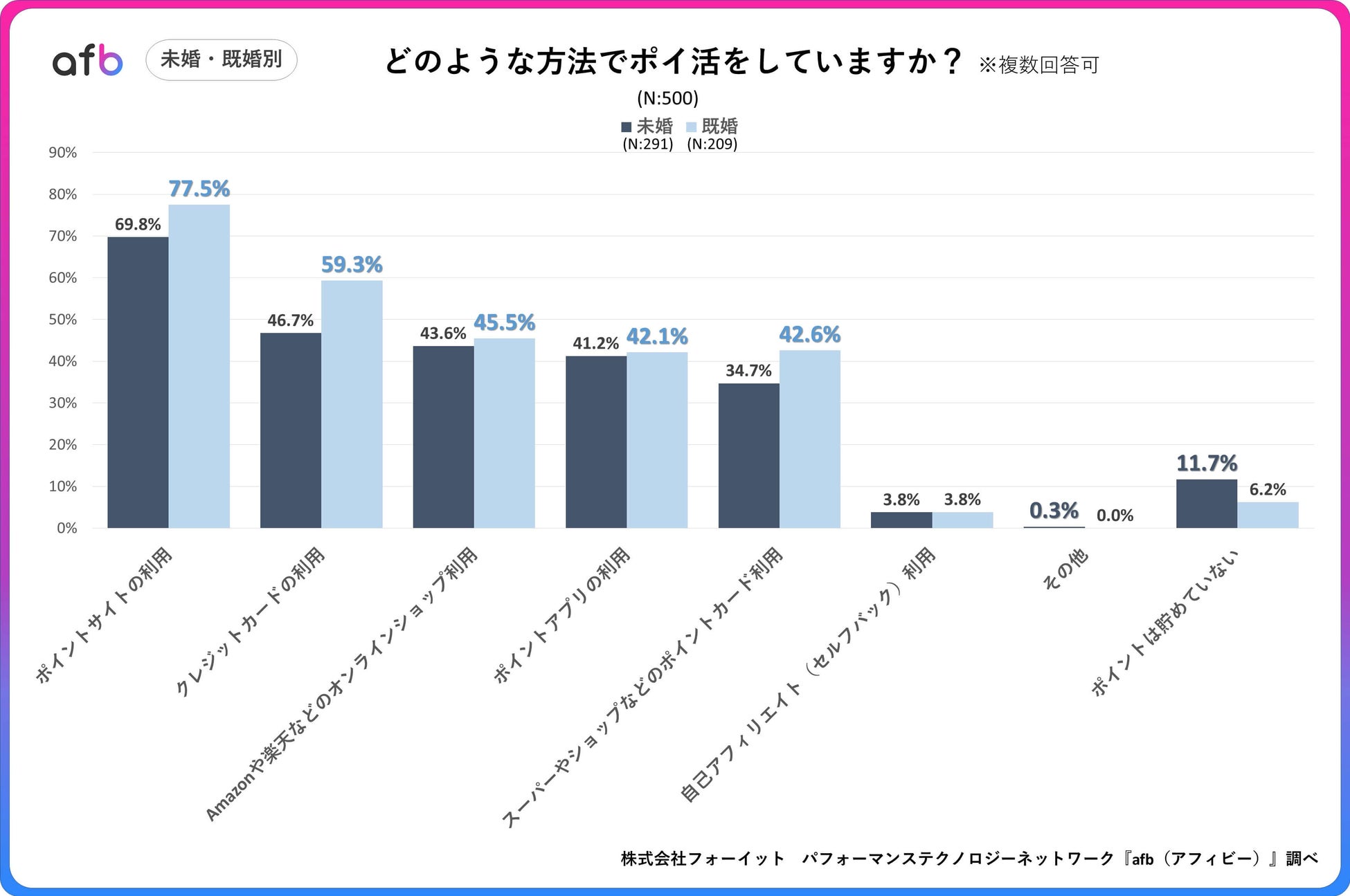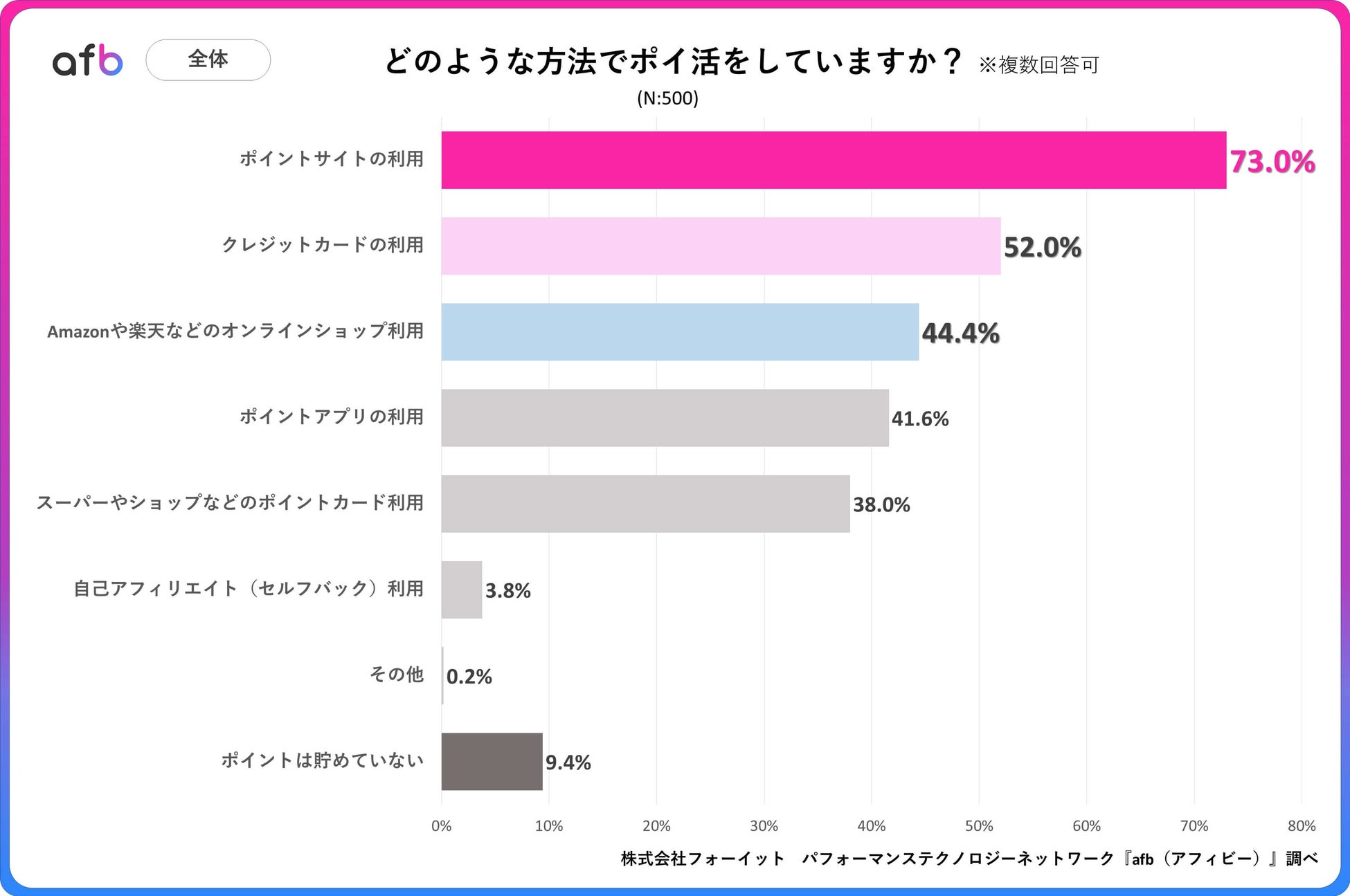 パフォーマンステクノロジーネットワーク「afb(アフィビー)」< https://www.afi-b.com/ >の開発運用をおこなう株式会社フォーイットは、全国の20歳~60歳までの男女500人を対象にポイ活に参考にする情報に関するアンケートを実施し、属性別の特徴についてまとめました。