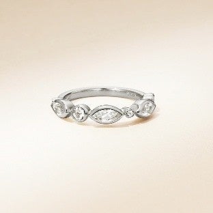 サイズや形も様々なストーンや地金を並べたリングは、海辺の白い小石や、傍に流れ着くガラスのビンの輝きに着想を得ました。指元にリュクスで上品な印象をプラスします。