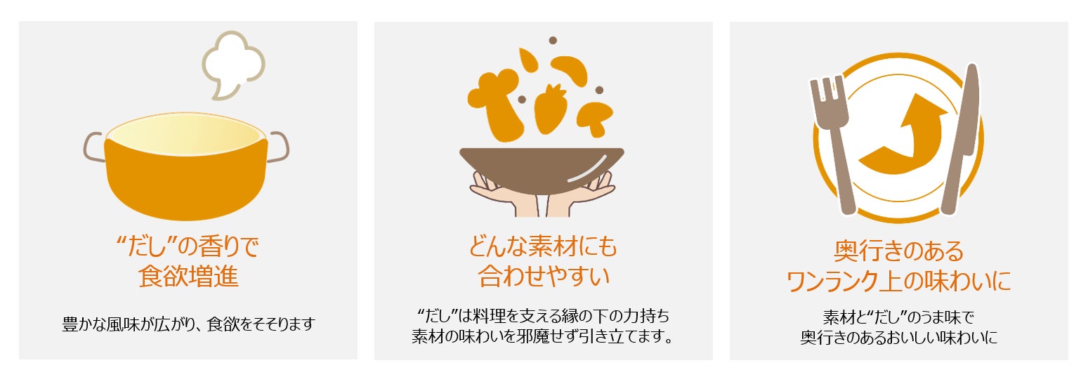 「年代問わず様々な場面で」「プラス素材で旨みをアップ」といった2つのこだわりポイントに注目し、本商品を開発いたしました。だしと食材を組み合わせることで、豊かな風味が広がる味わいになり、素材が引き立つワンランク上のお料理に仕上がります。