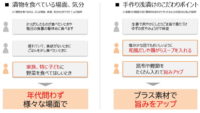 「浅漬け」と「レシピ」を含む検索ボリュームは5年間で約1.5倍に伸びるなど増加傾向にあり、浅漬けの素を使用せずに、調味料を組み合わせて作ろうとするニーズがあることが見受けられました。そこで “浅漬けの素”の付加価値をより探るために、“にんべんだしアンバサダー”138名に「漬物・浅漬けの楽しみ方」についてアンケートを行い、手作りのこだわりを検証いたしました。